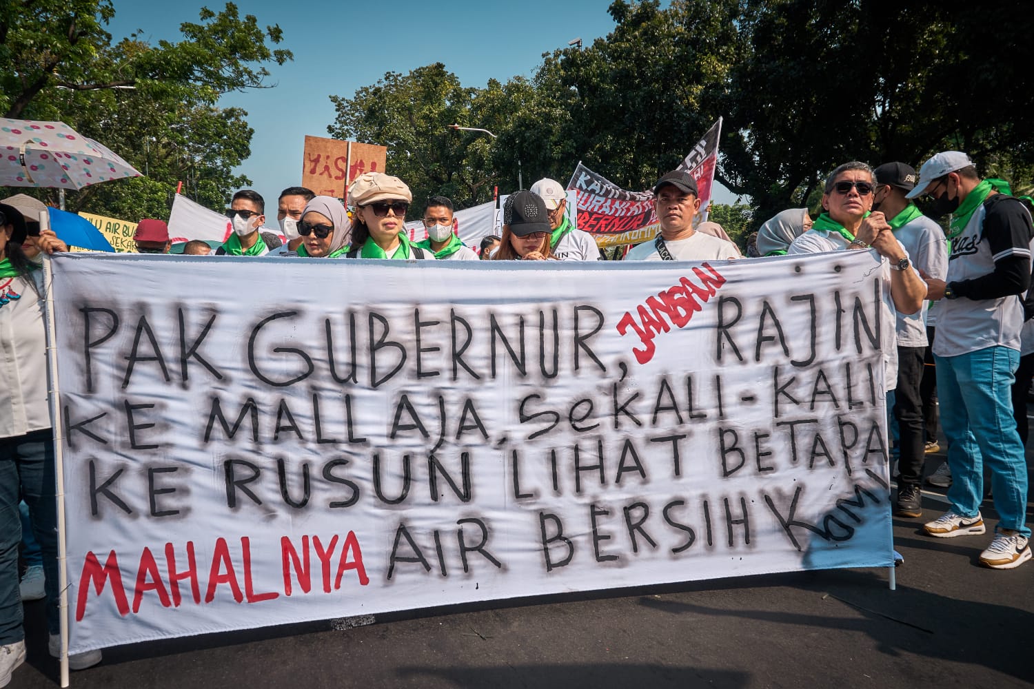 Dengan membawa poster bertuliskan “Rusun Bukan Mal”, “Tarif Air Kami Tidak Adil”, dan “Air Bersih Bukan Komoditas Mewah”, massa mendesak Gubernur DKI Jakarta agar segera mencabut atau merevisi kebijakan tarif air yang dinilai tidak sesuai dengan prinsip keadilan sosial.